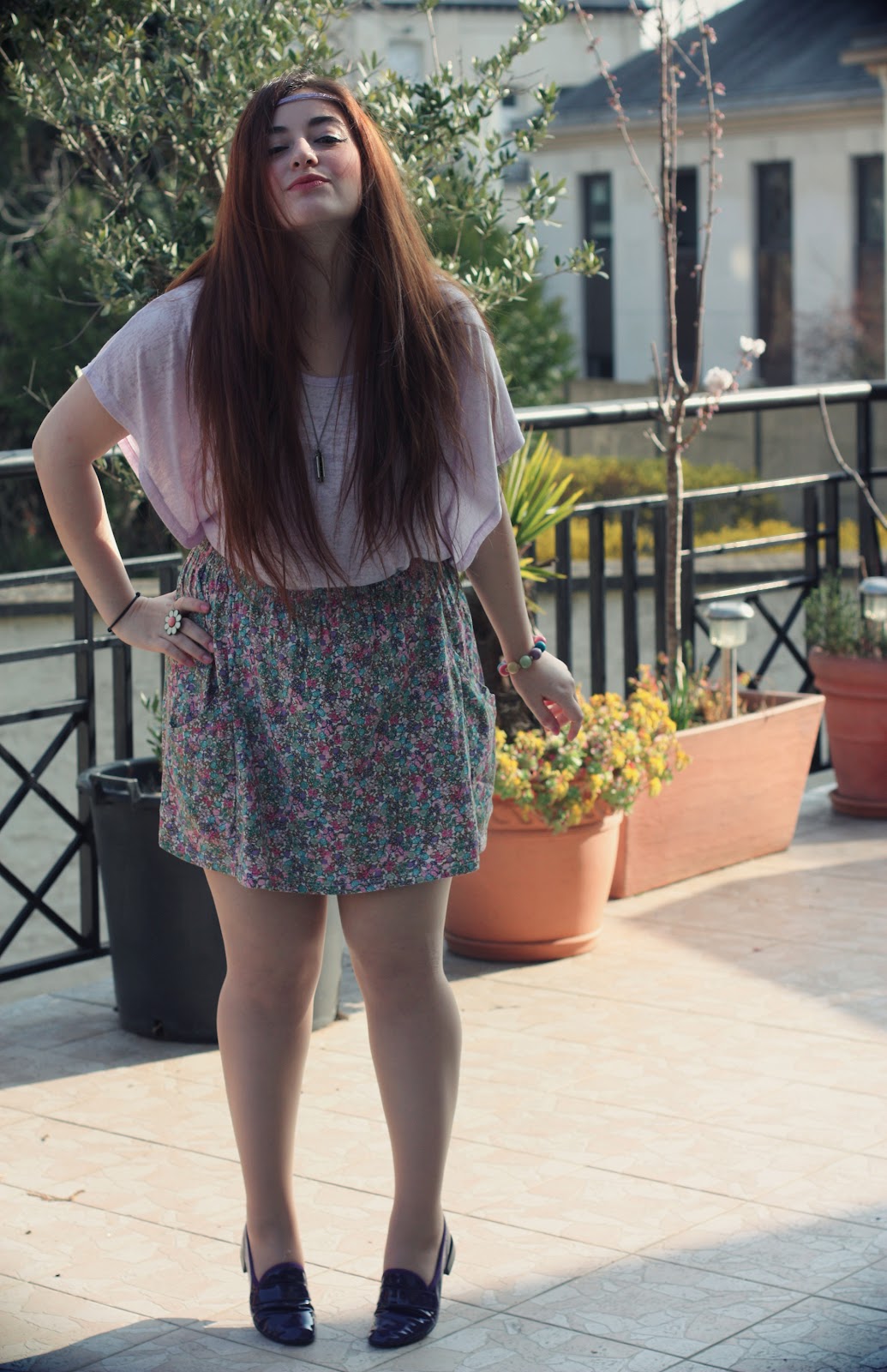 Here’s a little refreshing look that screams “Almost spring folks!”, The kind of outfit that will soon to bloom on the web (flower power), an association loose tshirt/high waist skirt, the perfect mix for summer days coming. And I wanted to show you my little purple jackson I love so much. Summer is near, I lose track of time, 24 hours is not enough to wrap everything (from what we want and what we must do per day … ehh), I prefer relaxing myself and plan my summer 2012 (can’t wait!) instead of working. What we can do against procrastination and dilettantism? Well not much, it’s a state of mind you know. It’s like telling a hyperactive person sleeping 3 hours per day, or ask bubble gum chewer to convert to yogurt. Hmm you kidding? No way ..