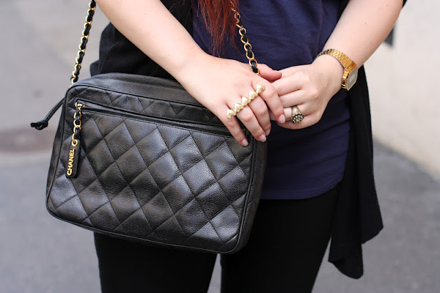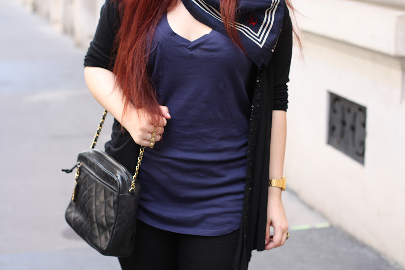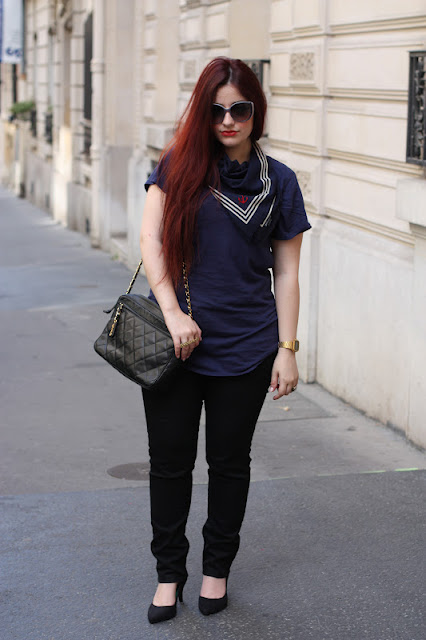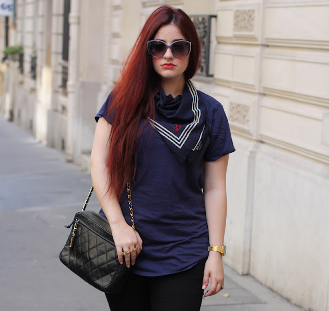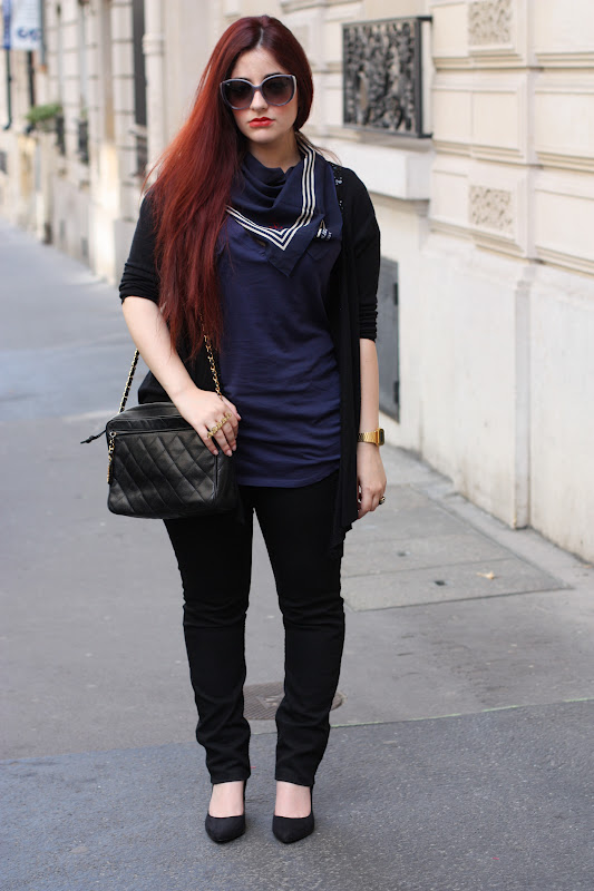 Hello friends ! J’espère que vos vacances se passent à merveille. Voici un petit look tout en simplicité, avec l’association noir/bleu-marine qui est loin d’avoir les validations de tous (y compris ma mère qui trouve ce mix illogique et contraire aux éthiques de la mode. Va savoir pourquoi? Maman, si tu me lis, tu me manques!). C’est vrai ça, un bon nombre de gens ont du mal à accorder ces deux teintes, pensant qu’il s’agisse d’un “fashion faux pas” (au même titre que les bottes blanches ou le rouge associé au rose). Mais bon sang, quand vont-ils comprendre que l’essentiel est de se sentir bien dans ses fringues en suivant ses propres règles? (Surtout que, bon, il n’y a pas mort d’hommes, en faisant ce genre de chose vous risquez au plus, d’offusquer votre voisin de métro très à même de comprendre les codes modesques, ou faire criser votre mère, n’ai-je pas raison?!). Alors chers amis, si vous apportez une quelconque importance à ces adages inscrits dans les mémoires de la culture mode, prenez garde : vous risquez sûrement de frôler l’infarctus en trainant par ici (rebeeeelle celle-ci dis donc) ! Ha, note importante : sur ces photos je porte le fameux basic en jersey de la marque Bobi Los Angeles dont je vous parlais dans un précédent article! N’est-il pas génial?! Comme quoi, on peut twister sans souci ces pièces à tendance sportswear afin d’agrémenter une tenue chic. Des bisous de Miami les amis !