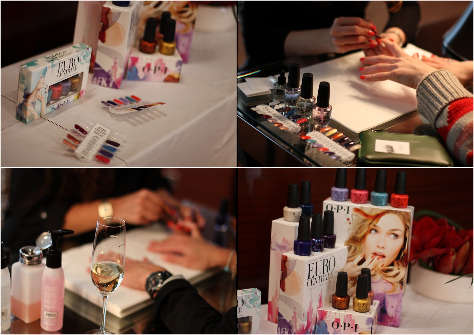 Dès notre arrivée dans la somptueuse suite, nous sommes invités à nous asseoir, accompagnés d’une flûte de Moët et de pop corn, afin d’assister à une conférence de presse tenant en la description de l’univers de la marque, autour de ses collections et de ses différents partenariats et collaborations, son histoire, son évolution, son impact et son influence. La dernière collaboration à venir : “Liquid Sand”, une ligne mettant en lumière la chanteuse Mariah Carey, où l’on trouvera notamment une grande nouveauté : le liquid sand, une texture inédite au rendu mat sans avoir recours à un top coat, avec de fines particules intégrées rendant la couleur scintillante. Une matière révolutionnaire qui, selon la directrice artistique d’OPI, “sera incontournable en 2013″. On veut bien la croire! Pour clôturer la conférence, nous avons eu le plaisir de découvrir la nouvelle publicité OPI pour la collection printemps été “Instinct of Color” en exclusivité, où le thème de la danse prédomine, rythmé par le titre Down the Road de C2C. Nous avons pu découvrir aussi la nouvelle collection Euro Centrale, une ligne éclectique rendant hommage aux différents pays d’Europe, comportant tant de points de convergences les uns des autres que l’on retrouve dans des teintes diamétralement opposées, portant des noms-jeux de mots très amusants tels que “A Woman Prague-ative”, “You’re Such a Budapest” ou encore le magnifique “I Saw… You Saw … We Saw… Warsaw” Après cela, un déjeuner nous attendait, ainsi que plusieurs nail bar à notre disposition afin d’arborer en avant première les collections printemps été qui ne seront en magasin qu’en février. Une aubaine, puisque dès le lendemain les gens s’attardaient sur ma superbe manucure et cette couleur inédite, et c’est avec une certaine délectation que je leur répondais qu’elle n’était pas encore disponible (je sais, je suis diabolique) ! Mais patience les amis, vous pourrez retrouver les trois collections printemps été 2013 Liquid Sand, Instinct of Color et Euro Centrale dès février 2013 en boutique !