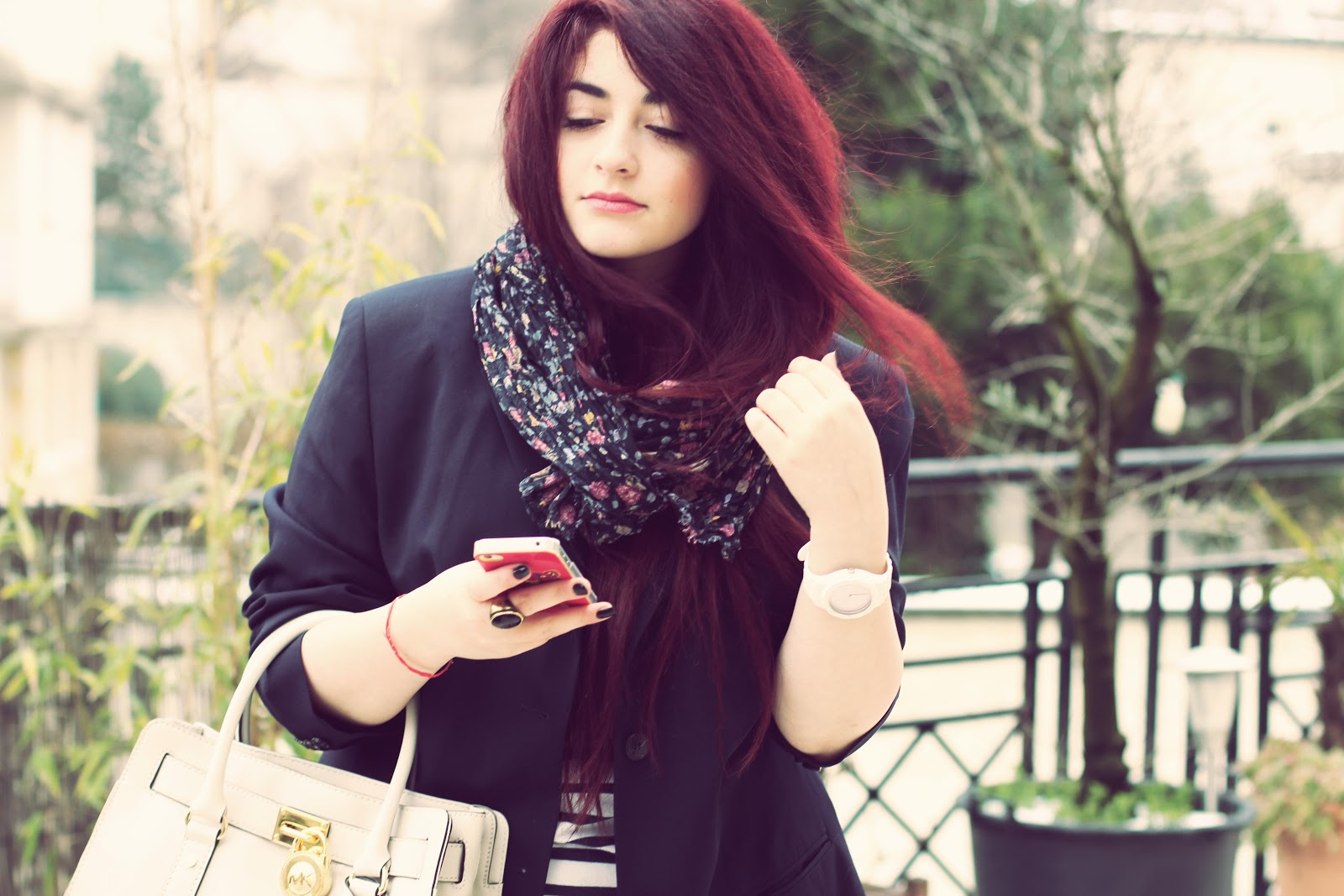 En ce moment, c’est encore l’effervescence de la Fashion Week à Paris. Et après avoir pu (malgré mon manque de temps cruel) assister à quelques défilés, j’ai pu cerner sans mal les grandes tendances à venir pour ce printemps été 2013, notamment la rayure. Et qui dit rayure, dit le grand come back de la marinière, forcément (qui commence doucement à refaire surface un peu partout dans les boutiques). J’ai donc ressorti la mienne pour un look en toute sobriété, relevé par un foulard à motif fleuri. Et vous n’avez pas pu louper ma nouvelle coque iPhone Kenzo commercialisé par Smart Addict by Modelabs, le blog des tendances mobiles qui réunit toutes les actus, accessoires et gadgets pour nos téléphones, la geek qui sommeille en moi adhère totalement au concept. Je vous laisse avec un morceau que j’écoute jusqu’au bout de mes nuits blanches depuis une semaine et dont je vous reparlerai la semaine prochaine plus en détails dans un article dédié. Muchos besos los amigos ! At this moment, it’s still the bustle of the Fashion Week in Paris. And after having (despite my cruel lack of time) attend some fashion shows, I could identify without difficulty the major future trends for spring summer 2013, including stripes. And who says stripes, says the great comeback of the sailor smock, necessarily (which slowly begins to resurface in shops). So I chose to let out mine for a sober outfit, spiced by a scarf with a floral pattern. And you don’t have to miss my new iPhone case Kenzo marketed by Smart Addict by Modelabs, the blog of trends for mobile that brings all news, gadgets and accessories for our phones, the geek who sleeping in myself fully supports the concept. I leave you with a song that I listen to the end of my sleepless nights for a week and I will talk about it next week in more detail in a dedicated section. Muchos besos los amigos!
