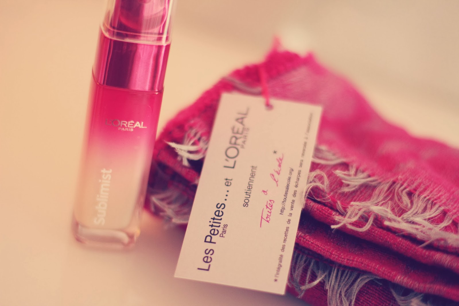 De plus, ce mois-ci (octobre rose) Sublimist s’associe à la marque de prêt-à-porter Les Petites… qui propose un foulard rose au prix de 40€ dont tous les bénéfices sont reversés à l’association Toutes à l’école. Une association qui me tient très à coeur car les dons serviront à scolariser des petites filles cambodgiennes. L’éducation, c’est fondamental, et on devrait tous y avoir droit. Un foulard acheté, c’est aussi un soin Sublimist offert. Alors on craque pour ce joli foulard assortie à la nouvelle gamme L’Oréal !