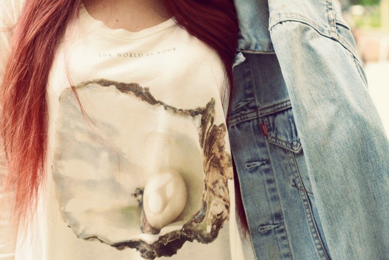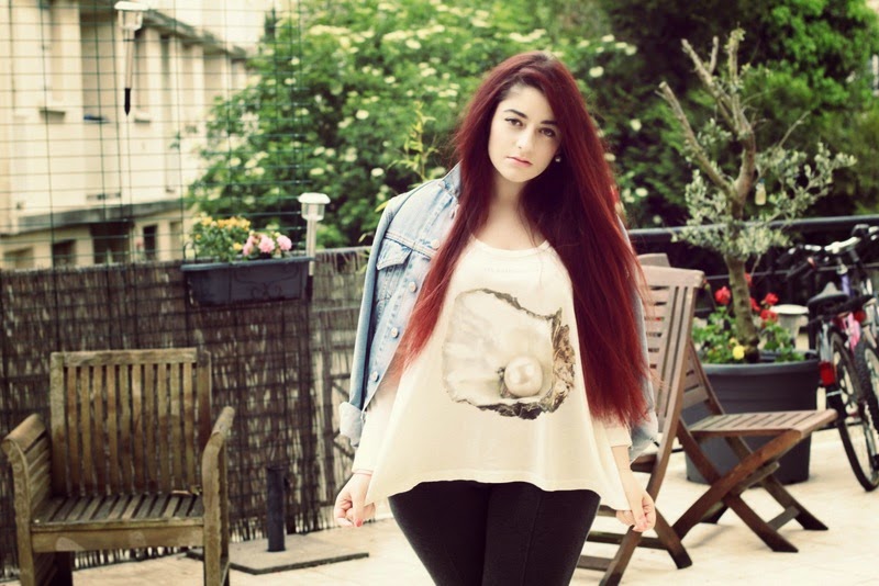 Or maybe under the rain to be more precise. In these days it’s like impossible to take outfits in photos because of the rain that we undergo in Paris. Fortunatelly, my camera is equiped with a tropical housing (how fun is that?!), so between to showers I played the little mermaid with my new Wildfox sweater that i loooove ! To celebrate my mermaid look, I put my beaded earrings. A blue jean jacket, pink mary jane and let’s go ! Concering music, nothing’s better than Iamamiwhoami, a hearing smoothly. Sun will be back on Wednesday in Paris, can’t wait, xoxo ♥
