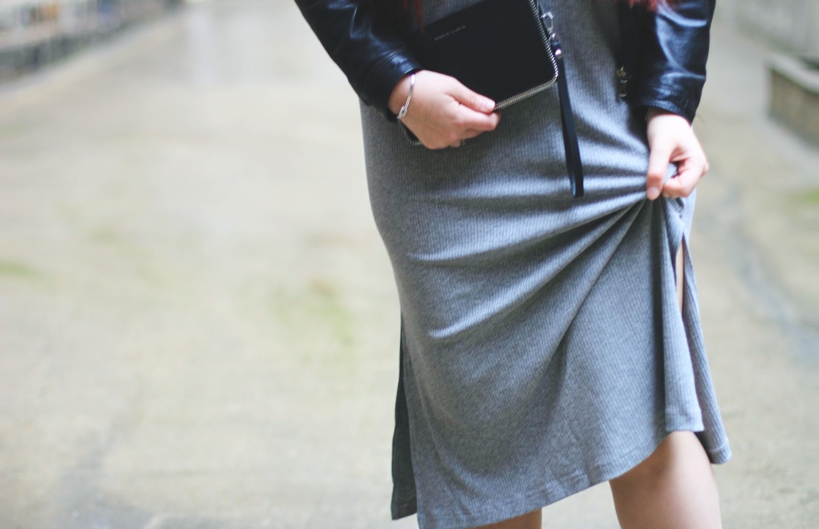 Hello mes douces ! J’espère que vous allez bien et que vous êtes prêtes pour la Fête des Mères ! Ces derniers jours n’ont pas été tendres avec nous, si bien que j’ai du shooter mon look de la semaine sous la pluie. Qui dit pluie, dit gris. C’est donc avec une logique implacable que j’ai sortie cette robe longue jersey côtelée de couleur grise de mon placard, déniché chez ASOS il y a deçà quelques semaines déjà. Pour rester au chaud, j’y ai associé ma veste en cuir. Un basique qui va presque avec tout, et que j’aime sortir lorsqu’il pleut. A mes pieds, je porte des … Slash par Comptoir des Cotonniers et Anne Valerie Hash. Un de mes modèles de baskets favoris. Voilà un an que je porte mes blanches sans relâche, et je ne m’en lasse pas. Mais cette fois, elles sont en tissus, et elles sont grises. D’ailleurs, elles sont disponibles en boutique et sur le site internet si elles vous intéressent ! Moi, je les adore presque autant que mes blanches si ce n’est plus ! Quant à la pochette, c’est une Charles & Keith, une marque notamment vendue aux Galeries Lafayettes. Une belle découverte à petits prix avec de très beaux accessoires à l’ADN rock ! À mon poignet, je porte un nouveau bracelet Swarovski absolument adorable, avec un petit noeud. Il me fait penser au bracelet knot de chez Céline, mais à un prix beaucoup plus attractif. Je vous laisse avec une cover de la chanson One Dance de Drake que j’aime d’amour, des besos mes douces !
