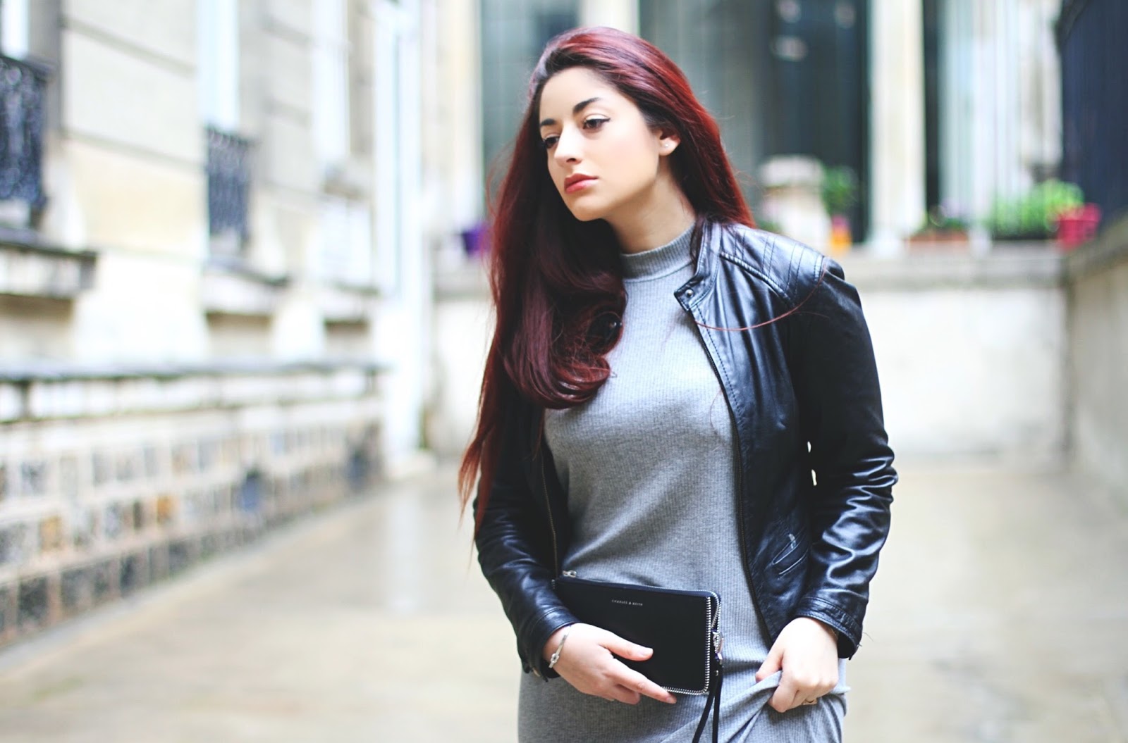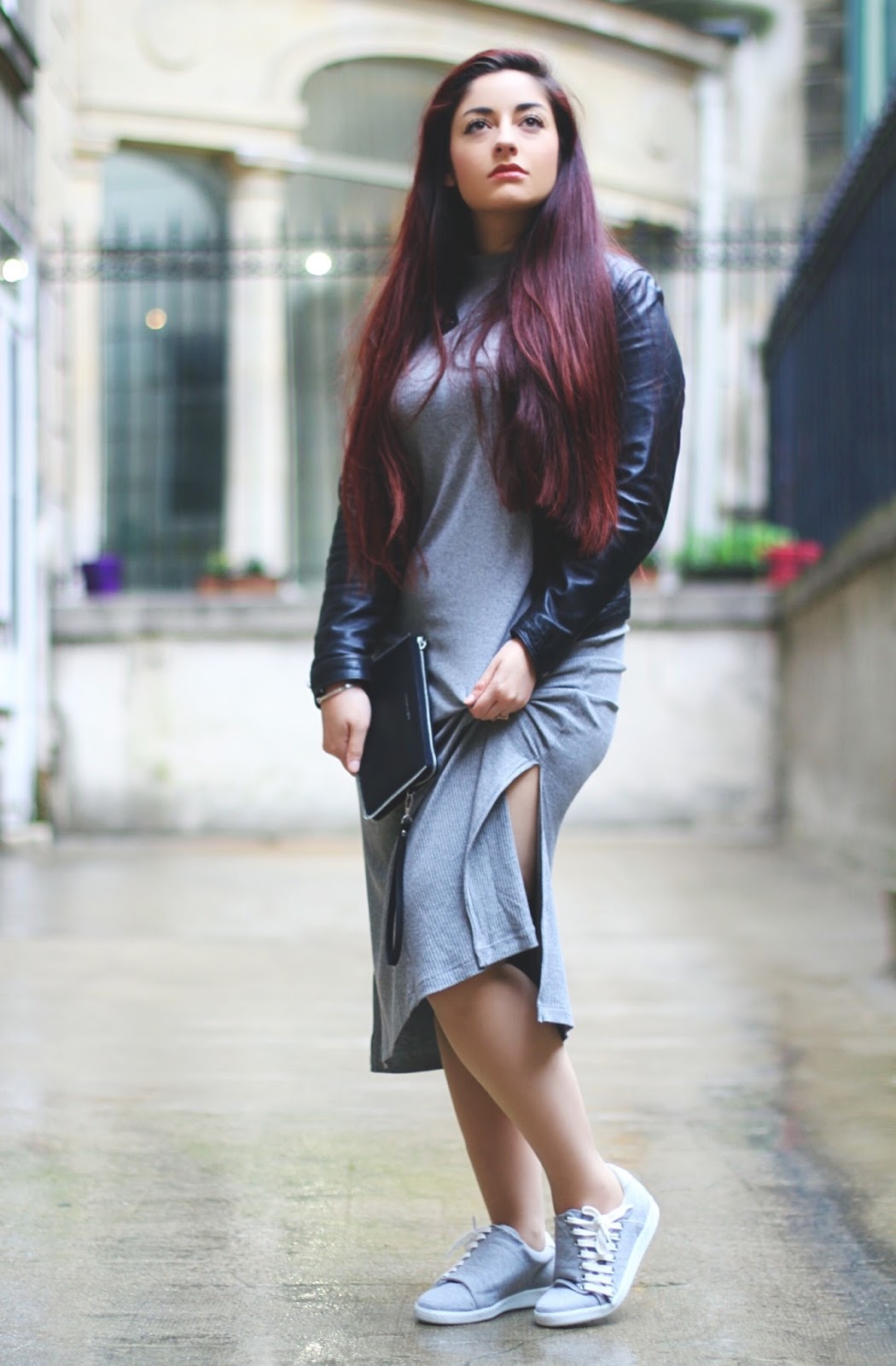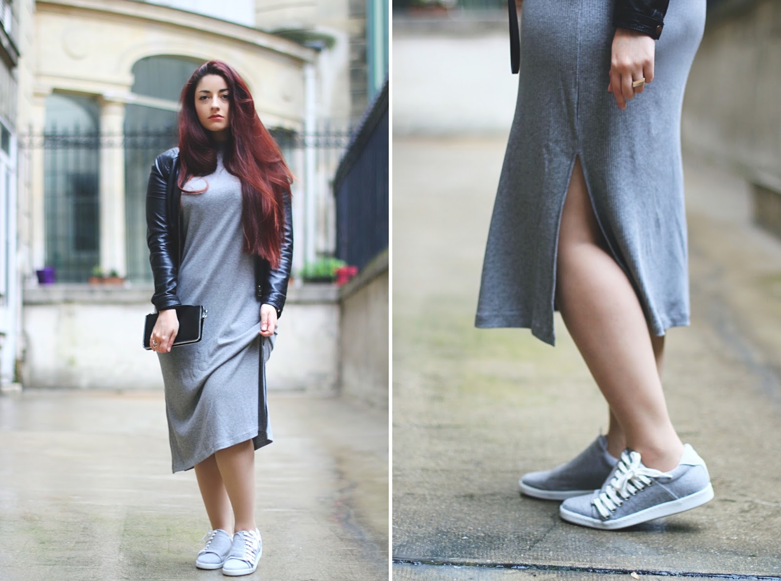Hi babes ! I hope you’re doing well and that you’re ready for Mothers’ Day ! These last days weren’t tender with us, so much cold and rain .. So I have to took in picture my outfit under the rain. And when you speak about raining, I’m thinking grey, so I decided to wear my grey dress, found on ASOS ! With it, my lovely leather jacket and my new sneakers Slash by Comptoir des Cotonniers. About my clutch, it’s from, a brand sold at Galeries Lafayette France ! So pretty things, with rock DNA ! Xoxo babes !
