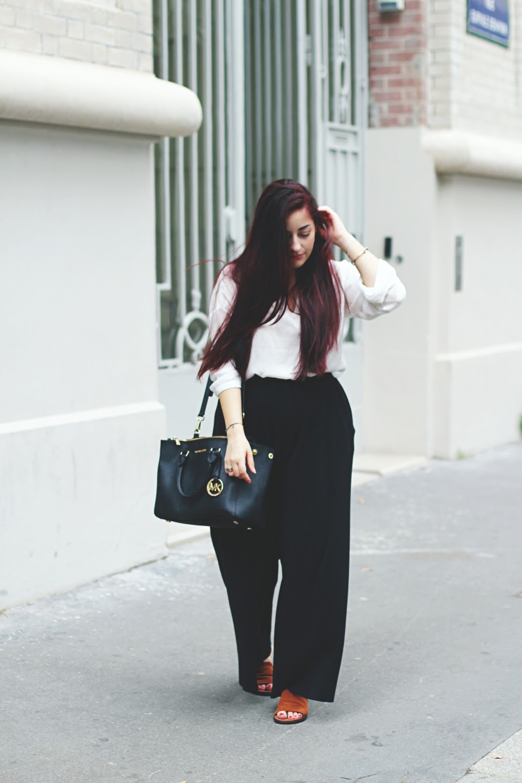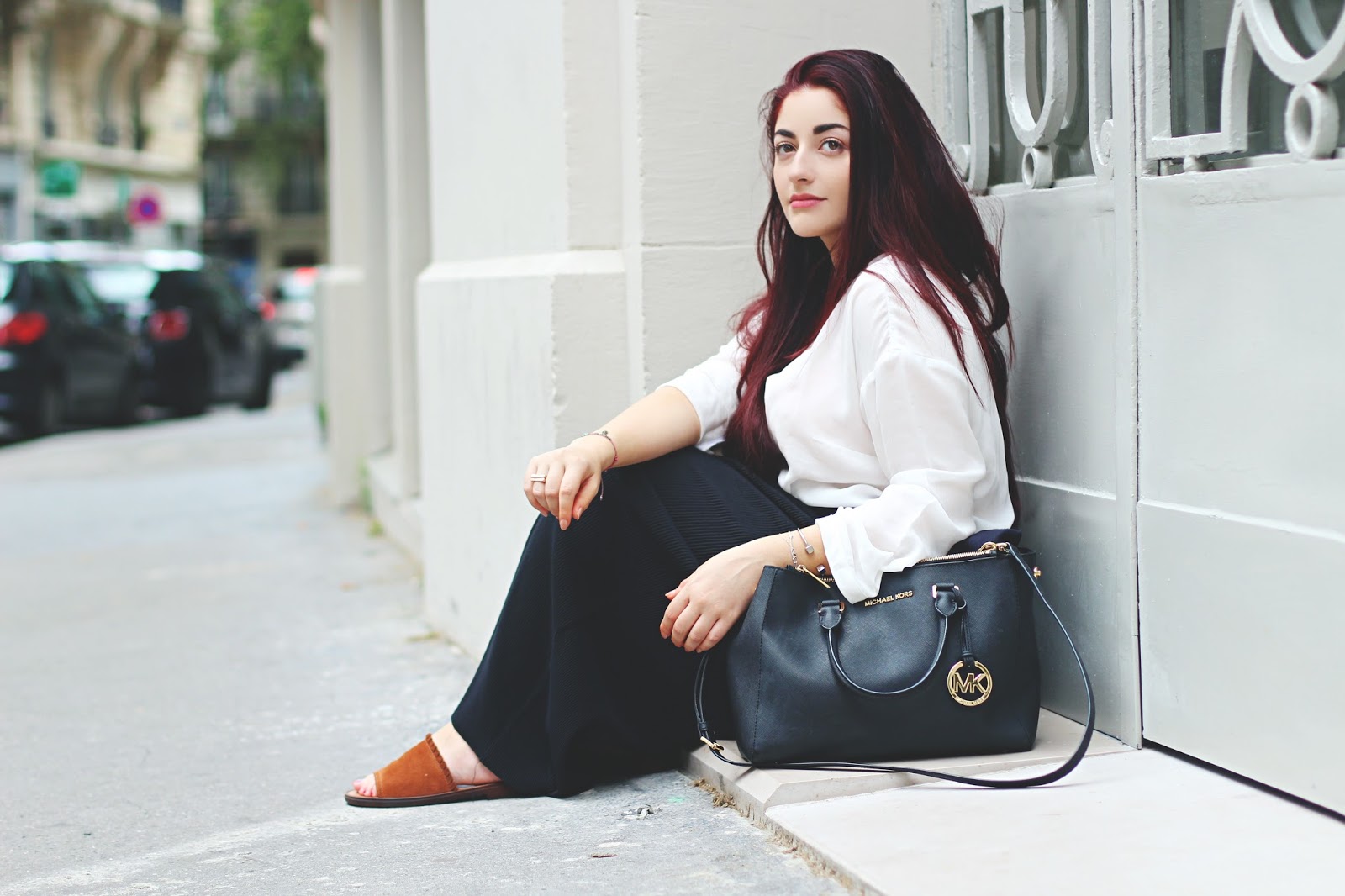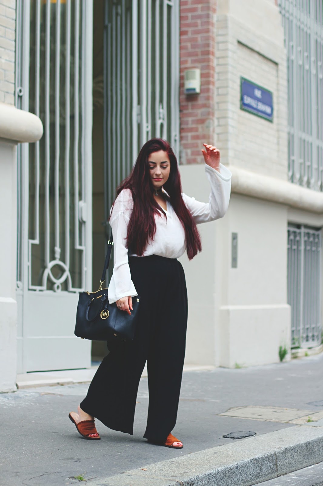 J’aime beaucoup ce genre de look à la fois très comfy et plutôt élégant. J’ai associé deux pièces que j’aime énormément : le pantalon oversize taille haute, couleur noir, ultra léger, parfait quand il fait très chaud, et la chemise minimaliste blanche, avec un col V très épuré, et des manches évasées. Des basiques que l’on peut mixer ensemble mais également avec des pièces fortes. Pour moi, ce sont des pièces à avoir absolument dans sa garde robe. Au fil du temps, les basiques évoluent : le simple pantalon noir devient oversize, et la petite chemise blanche à bouton se simplifie… On garde l’idée, on modifie deux trois petits détails : l’essentiel reste, le superflu est retiré. Le noir, le blanc, un sac en cuir et on y est presque !