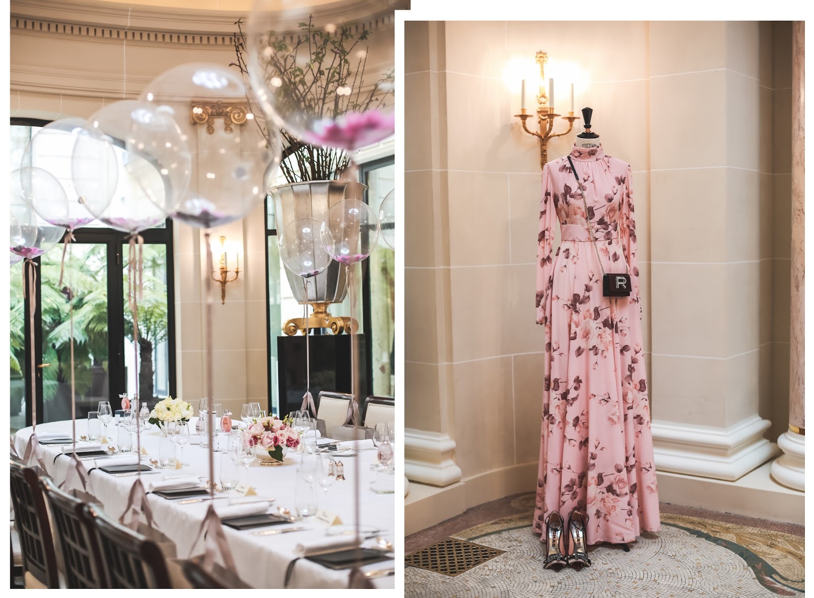 C’est au salon La Rotonde où nous avions rendez-vous. Un écrin sublime baigné de lumière, à la décoration élégante et raffinée. Au coeur de la pièce, on y trouve cette oeuvre de Crystal signé maison Lasvit, que j’aurais bien aimé ramener chez moi. Je découvre pour la première fois le lieu dans cette disposition, avec en son centre cette belle et longue table. Des ballons remplis de confettis ornaient l’espace, ainsi que de jolies compositions florales et quelques pièces couture de la collection Rochas printemps été 2017.