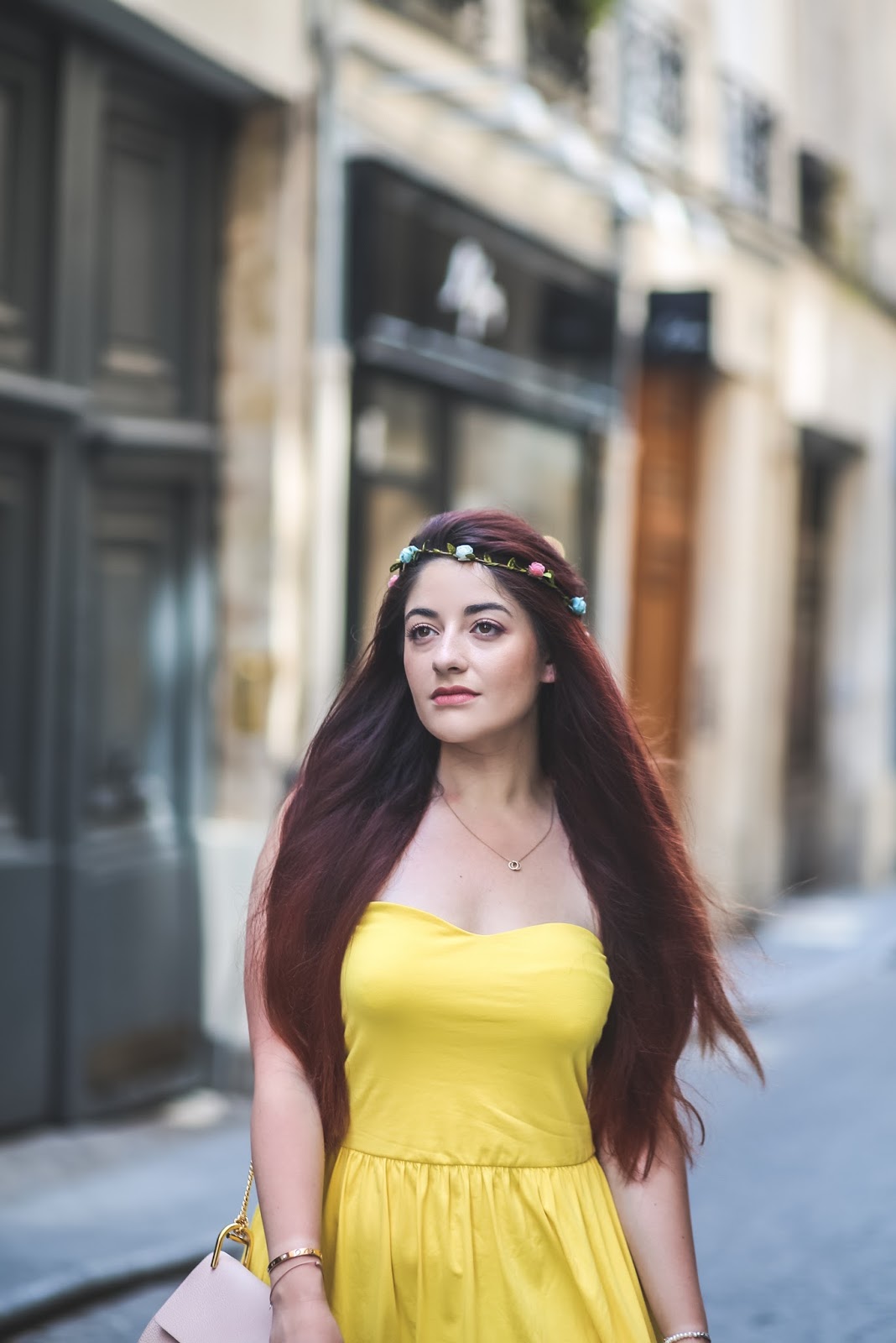 Cette robe jaune poussin… Je ne l’ai jamais commandé. Et pourtant elle est apparu un beau jour dans un de mes colis ASOS. Sortie de je ne sais où. Je ne sais également pas par quel miracle, mais elle était à ma taille. J’ai eu le coup de coeur pour sa forme, sa simplicité, et sa couleur jaune poussin ! Du coup, je l’ai gardé ! J’aime énormément porter du jaune et des couleurs vives pendant l’été, ça donne un coup de boost au moral étrangement, vous ne trouvez pas ? Je porte cette jolie robe jaune poussin avec des sandales à talons rose bébé trouvées chez H&M il y a quelques semaines ! Sur mes pieds bronzés cet été, elles seront du plus bel effet. Et dans mes cheveux, toujours une couronne de fleurs. Et pour celles et ceux qui me demandent si je porte vraiment la couronne de fleur dans la rue, ma réponse est oui ! Je vous laisse avec ma petite chanson du moment, je vous embrasse, et je vous souhaite un joyeux 14 juillet ! J’ai hâte de vous retrouver ! À très vite mes douces !